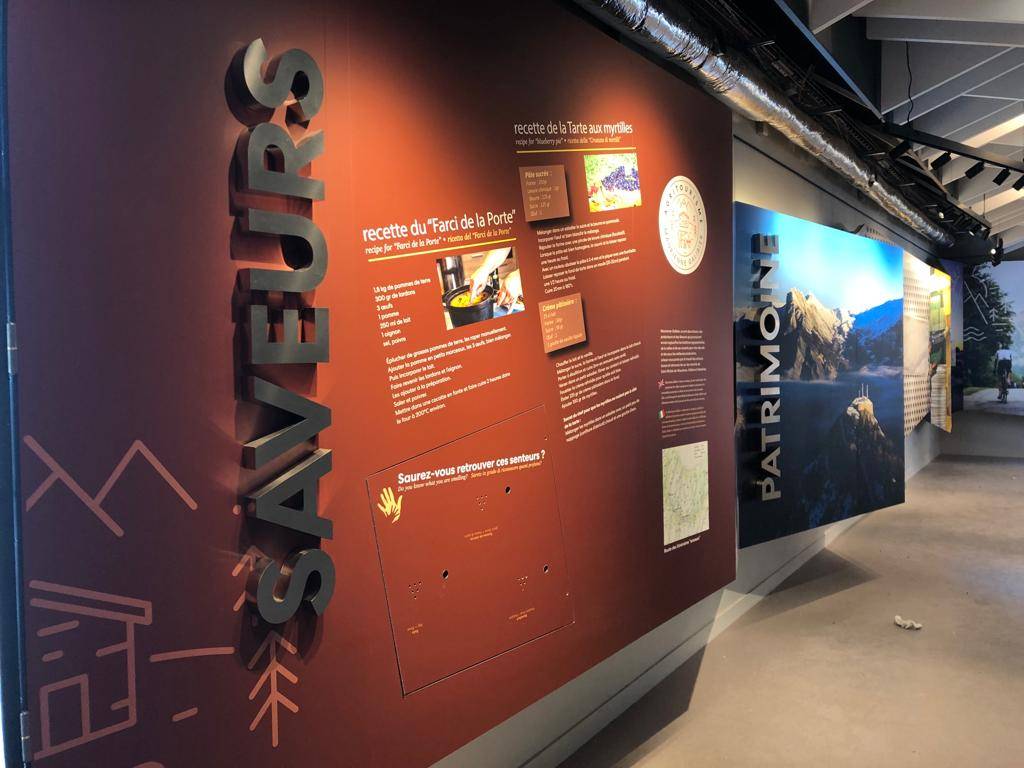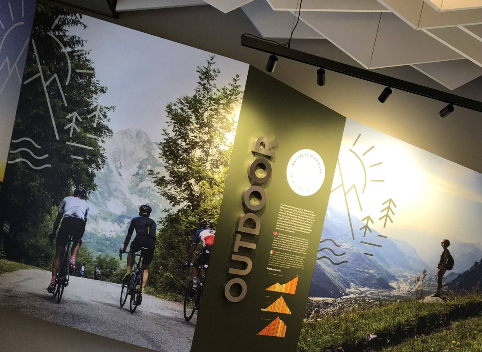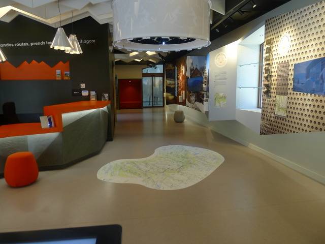 Nous réalisons également pour cet office de tourisme l'impression d'un visuel spécial sol qui représente une carte IGN de la Maurienne et des visuels adhésifs sur les cloisons murales. La scénographie de cet office de tourisme est vraiment belle.